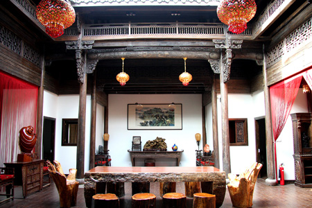 徽派古建筑:园区古建筑以徽派风格为主,百余栋徽派古民居及古桥、古牌坊。其中包括有雕花楼、民宅、花厅、祠堂等不同风格,另外还有3座古牌坊。园子完全建成后,会展现9亭24桥的风貌。